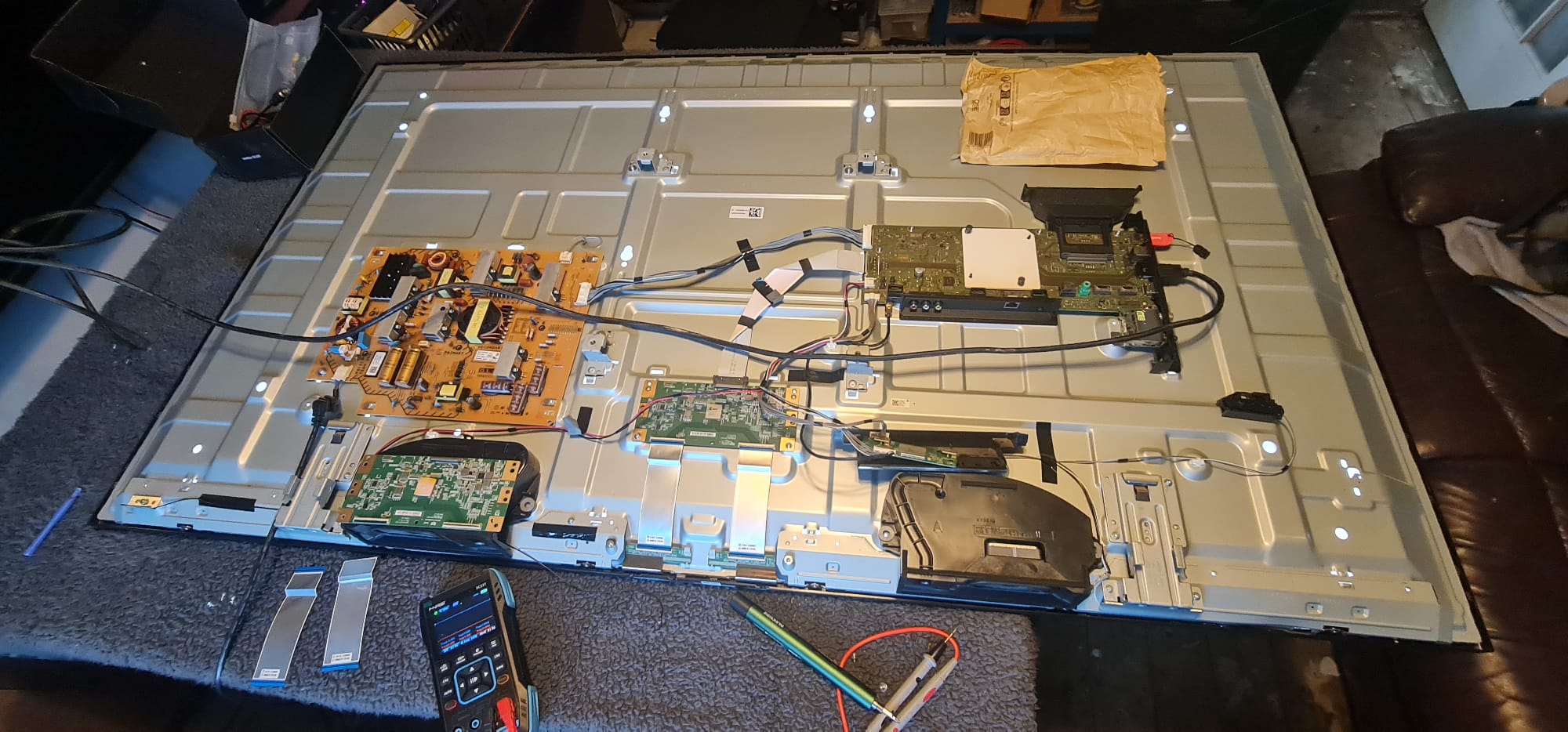 The T-con was never the problem. It wasn't getting power. A single MOSFET on the power supply wasn't switching the 12V rail through, so the T-con had no juice to drive the panel. Every other function — Android, HDMI, audio, backlight — runs off different rails and worked perfectly.