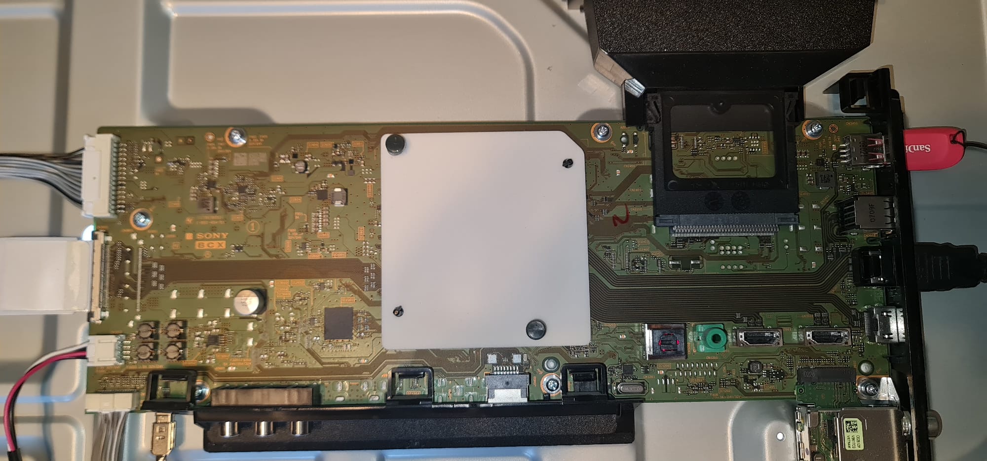 On power-up: solid white LED (no fault codes), backlight clearly on behind the panel, but absolutely nothing on screen. No Sony logo on boot. No menu. Nothing. HDMI audio worked — you could hear content playing through the speakers. The TV thought it was running normally.