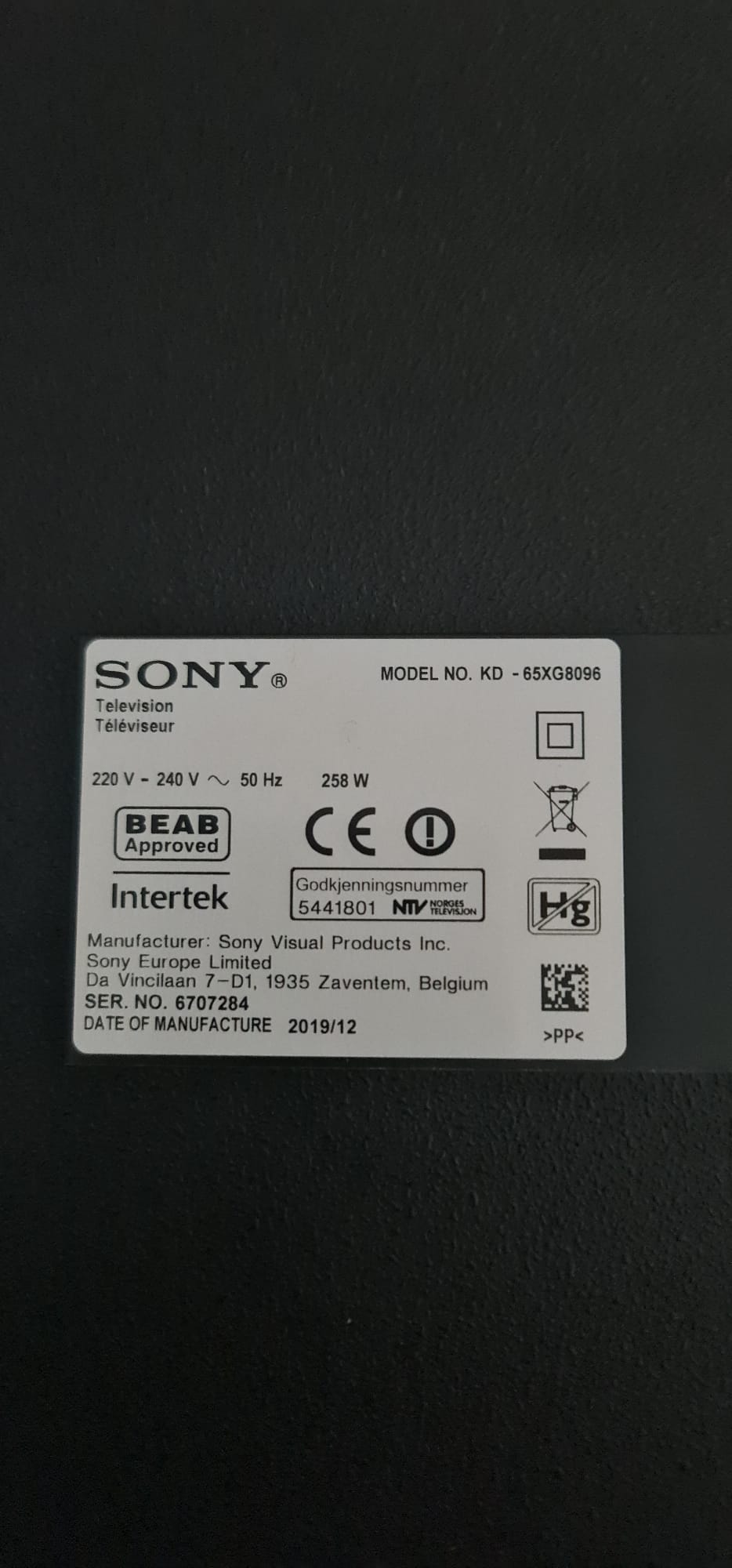 A 2019 Sony KD-65XG8096. 4K, Android TV, 258W. The previous owner had already swapped the T-con board trying to fix it. It didn't help. They gave up and listed it for free.