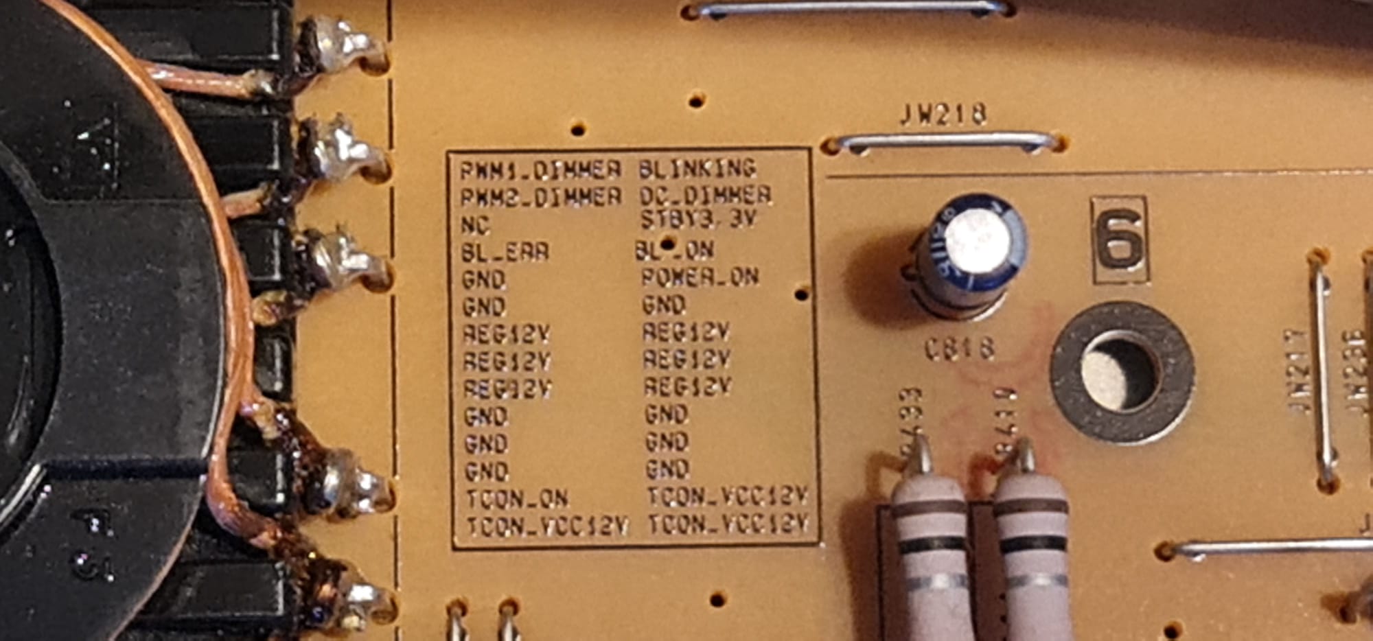 | Pin | Expected | Measured | |-----|----------|----------| | TCON_ON | 3.3V (enable) | 3.3V | | REG12V | 12V | 12V | | TCON_VCC12V | 12V | 3.3V |