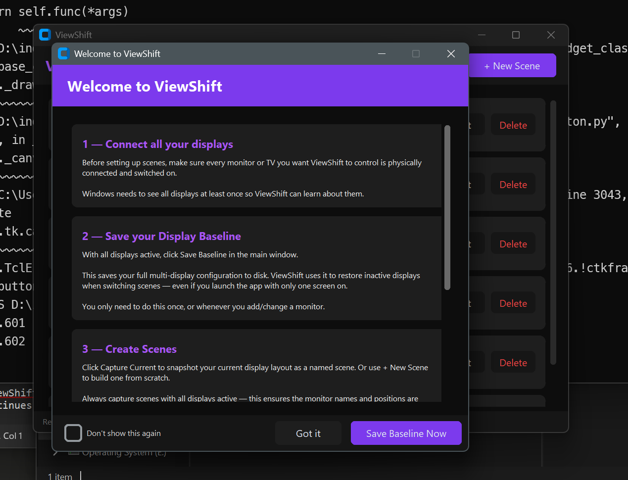 ViewShift handles this with a first-run guide. On first launch it walks you through the setup: connect everything, save a baseline, create scenes, use the tray. At the bottom there's a Save Baseline Now button that locks in your full display config to disk in one click.